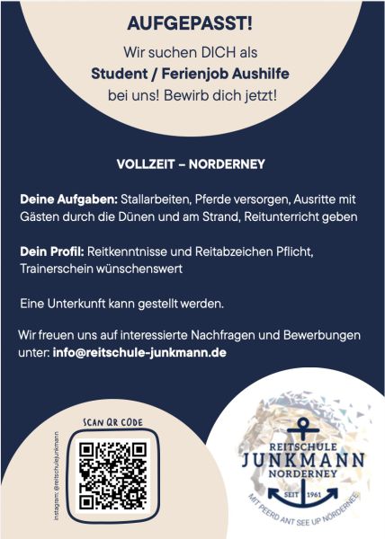Ferienjob/Aushilfe Vollzeit – NORDERNEY gesucht! Aufgaben: Stallarbeiten, Pferde versorgen, Ausritte mit Gästen durch die Dünen und am Strand, Reitunterricht geben. Profil: Reitkenntnisse und Reitabzeichen Pflicht, Trainerschein wünschenswert. Unterkunft kann gestellt werden. Bewerbungen unter: info[at]reitschule-junkmann.de