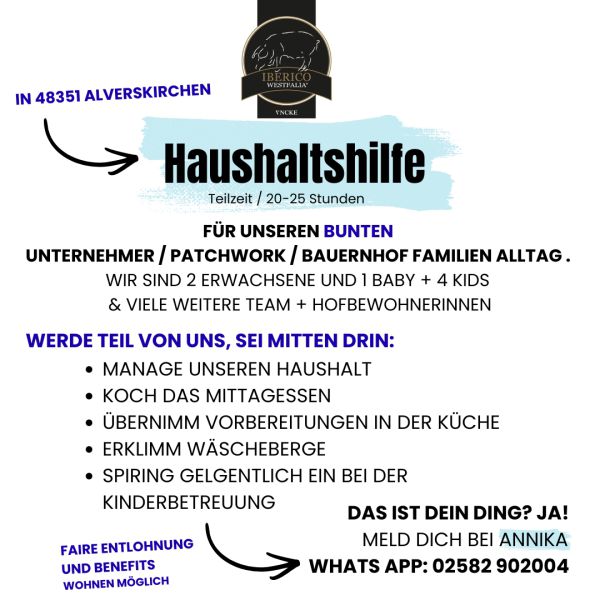 Lust auf einen abwechslungsreichen Job, der mehr ist als nur ein Job? Manage unseren bunten Unternehmerhaushalt, erklimme die Wäscheberge und sei mitten drin mit Gespür für das was gebraucht wird um den Alltag hier zu meistern. In Alverskirchen, Teilzeit an mind. 3 Tagen/Woche. Faire Entlohnung, Wohnen möglich WhatsApp an Annika 02582902004
