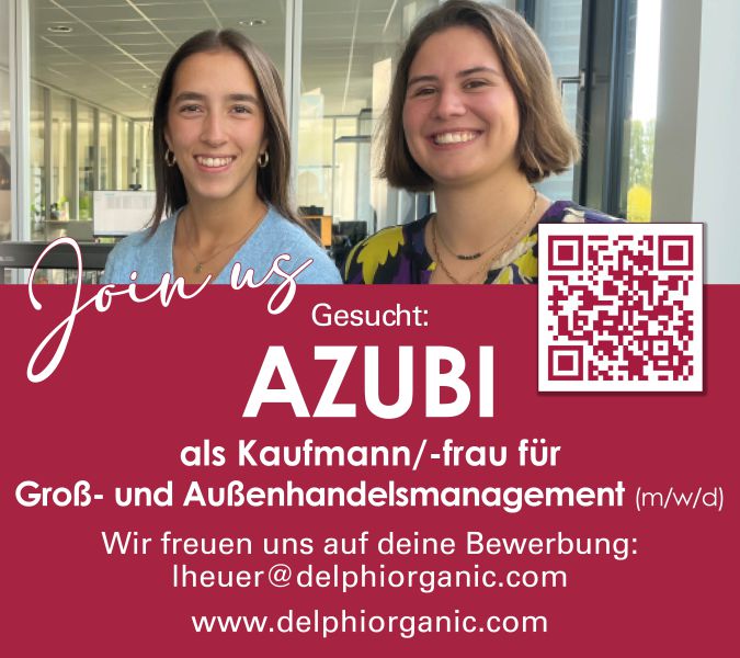 Auszubildende (m/w/d) als Kaufmann für Groß- und Außenhandelsmanagement gesucht! Du bist kommunikativ und verfügst über organisatorische Fähigkeiten? Kannst mit Zahlen umgehen? Begeisterst Dich für Fremdsprachen? Dann lerne die vielseitige Welt des Großhandels im Bio-Sektor kennen. Als Voraussetzung bringst du die Fachoberschulreife mit. Bewerbungen an: lheuer[at]delphiorganic.com www.delphiorganic.com