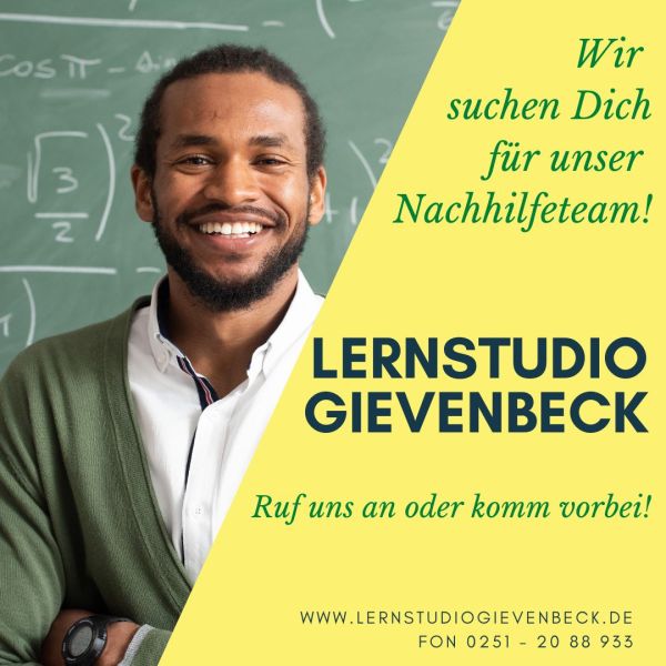 Mot. NachhilfelehrerInnen in allen Fächern für unser Lernstudios in Gievenbeck/Havixbeck gesucht. Faire Bezahlung, angen. fam. Atmosphäre, wertv. Praxiserfahrung f. Studium. Erwartet werden Spaß u. Freude am Unterrichten. Bewerbung unter 0177 – 5474508 + info[at]ls-gievenbeck.de