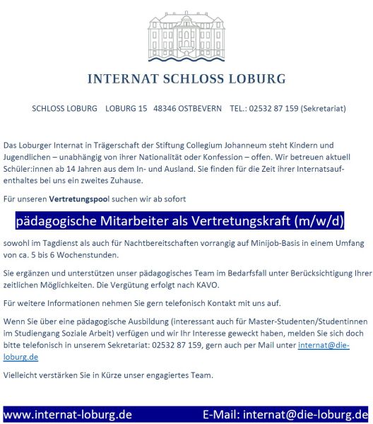 Das Internat Loburg sucht zur Betreuung unserer Jugendlichen pädagogische Vertretungs- und Nachtbereitschaftskräfte auf Minijobbasis in einem Umfang von ca. 5 bis 6 Wochenstunden. Die Vergütung erfolgt nach KAVO. Wir freuen uns auf interessierte Nachfragen und Bewerbungen unter: internat[at]die-loburg.de