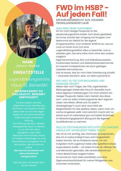 FSJler*in gesucht! Du weißt noch nicht, was Du nach der Schule machen möchtest? Du hast Lust auf Pädagogik und Handwerk? Komm für einen Freiwilligendienst zu uns in die Jugendbildungsstätte Haus St. Benedikt in Billerbeck! Wir freuen uns auf Deine Nachricht an zumbuelte[at]abtei-gerleve.de; Infos: https://www.abtei-gerleve.de/hsb/freiwilligendienst/