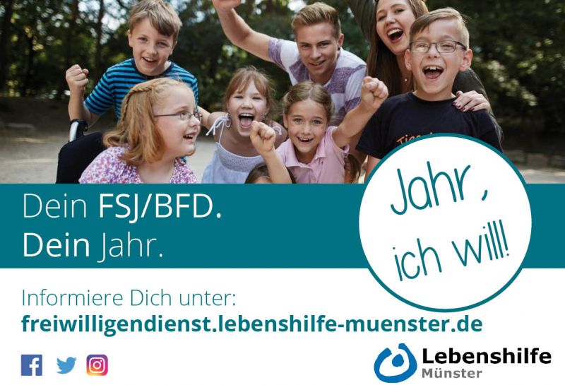 „Jahr, ich will!“ - Dein FSJ/ BFD bei der Lebenshilfe Münster! Zum Beispiel im Freizeitbereich, im Wohnnest oder in unseren Wohnhäusern Meesenstiege und Edelbach. Alle Informationen und kleine Einblicke in den Alltag unserer FSJler/BFDler*innen findet ihr unter freiwilligendienst.lebenshilfe-muenster.de! Wir freuen uns auf euch!