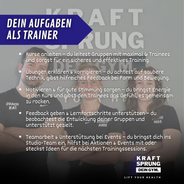 Bewegungsexperte/-expertin gesucht! Werde Teil des Kraftsprung Teams! Du liebst Sport, Bewegung und echte Ergebnisse? Du hast fundierte Kenntnisse, motivierst Menschen, bringst sie an ihre Grenzen – und das mit einem Lächeln? Dann bist du bei uns richtig! Wir bieten Functional- & Personal Training – immer persönlich, effektiv und mit Spaß. Werde Teil des Teams und gestalte mit uns Trainings, die wirklich etwas bewegen! Whatsapp: 015253967161 o. info[at]kraftsprung-muenster.de