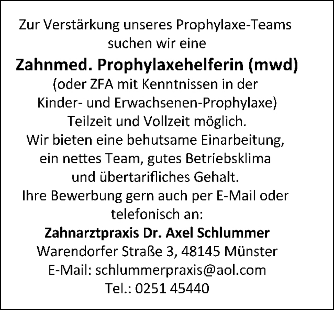 Zur Verstärkung unseres Teams in MS-Gremmendorf suchen wir eine AZUBI & ZMS VollZ/TeilZ od. Minijob-Basis. Wir bieten flexible Arbeits- und Urlaubszeiten, übertarifliches Gehalt, Fortbild.mögl. u. vieles mehr. Wir freuen uns auf deine Bewerbung: drchorstmann[at]gmx.de, 0251/626566