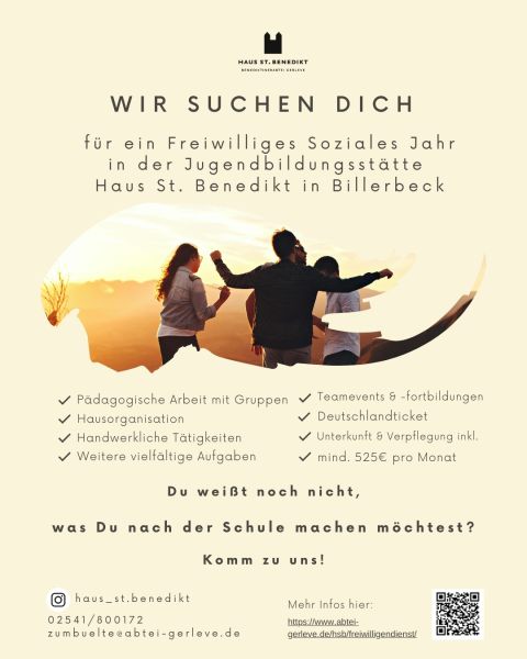 FSJler*in gesucht! Du weißt noch nicht, was Du nach der Schule machen möchtest? Du hast Lust auf Pädagogik und Handwerk? Komm für einen Freiwilligendienst zu uns in die Jugendbildungsstätte Haus St. Benedikt in Billerbeck! Wir freuen uns auf Deine Nachricht an zumbuelte[at]abtei-gerleve.de