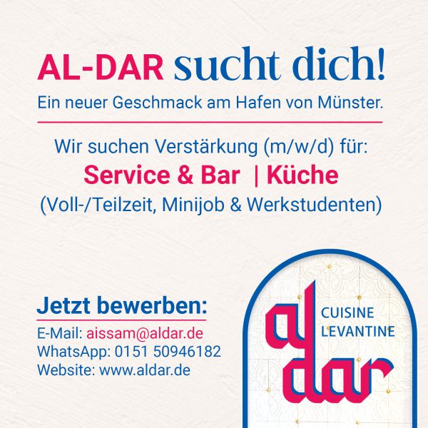 AL-DAR sucht dich! – Verstärkung am Hafen von Münster. Mitarbeiter (m/w/d) für Service, Bar & Küche (Vollzeit, Teilzeit, Minijob & Werkstudenten). Start: Ab sofort! Wir sind bereits geöffnet und suchen zur Verstärkung unseres Teams motivierte Unterstützung. Wir vereinen gehobene levantinische Küche mit echter Gastfreundschaft. Vorteile bei uns: Attraktive, leistungsgerechte Vergütung, faire Trinkgeldverteilung, Mitarbeiterrabatte & ein herzliches Team. Du hast Lust, Teil von etwas Besonderem zu werden? Dann bewirb dich jetzt! --- Kontakt: aissam(at)aldar.de . Wir freuen uns auf dich – dein AL-DAR-Team