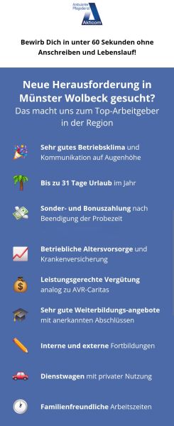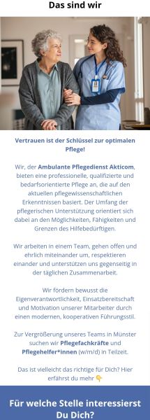 Pflegekräfte gesucht – mit Herz und Handschuhen! Du hast ein Herz für Menschen, einen kühlen Kopf in heißen Phasen und kannst ein Tablett von einem Tablet unterscheiden? Dann komm zu uns! Wir suchen Pflegekräfte (m/w/d) – in Vollzeit, Teilzeit oder auf geringfügiger Basis. Bei uns gibt’s nicht nur freundliche Kollegen und faire Bezahlung, sondern auch Wertschätzung, Humor und echten Teamgeist. Jetzt bewerben und Pflege neu erleben! 02506-303810 oder info[at]pflegedienst-akticom.de