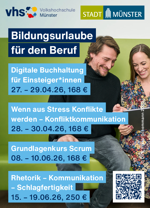 Kursleiter*in für Eltern-Baby- oder Eltern-Kind-Kurse gesucht! Du bist engagiert und emphatisch? Als Erzieher*in, Sozialpädagog*in oder mit einer vergleichbaren Qualifikation hast Du Lust auf eine Honorartätigkeit an der vhs Münster? Wir freuen uns auf Deine Kontaktaufnahme: breitkopfa[at]stadt-muenster.de oder 0251-492-4302