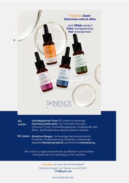 Flexibles Zusatz-Einkommen online & offline als Affiliate unserer hochwertigen Dermokosmetikmarke. Keine Vertragsbindung. Kein Anfangsinvest. Wir suchen Vertriebspartner*innen: Gut vernetzte Personen, Influencer*innen, Studierende oder Eltern. Wir sind ein junges Unternehmen aus Münster und möchten vertrauensvoll und nachhaltig mit Dir wachsen. Schreib uns gerne: info[at]jayblu.de