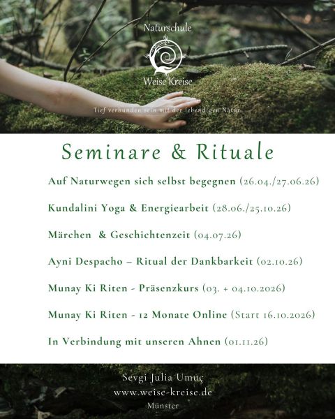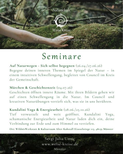Auf Naturwegen · Kundalini Yoga & Energiearbeit · Märchenzeit, Seminare Apr–Juli, verbunden sein mit der lebendigen Natur und dir. www.weise-kreise.de