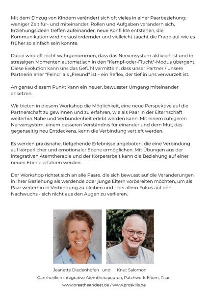 Eltern sein – Paar bleiben! Der Workshop richtet sich an alle Paare, die sich bewusst auf die Veränderungen in ihrer Beziehung als werdende oder junge Eltern vorbereiten möchten, um als Paar weiterhin in Verbindung zu bleiben. 25.4.2026, 15-17:30 Uhr, 90€/Paar www.breatheandeat.de/Breathe/