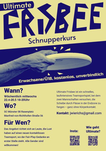 Schnupperkurs Ultimate Frisbee. Fairer Teamsport. Ab 18, kostenlos, unverbindlich. 22.04. - 20.05., mittwochs 18h - 20h, Rasenplatz SC Münster 08