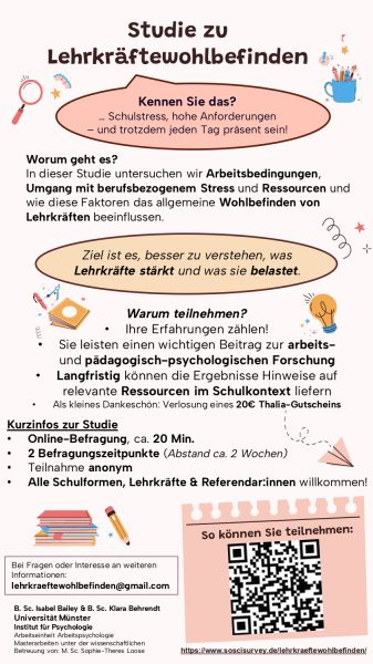 Lehrkräfte & Referendar*innen: Ihr Wohlbefinden zählt! Psychologische Abschlussarbeiten der Uni Münster (20 Min) https://www.soscisurvey.de/lehrkraeftewohlbefinden/