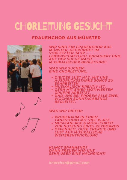 Frauenchor aus MS sucht Leitung für Proben sonntagabends 2x/Monat. Du bist Kreativ & offen? Mail an: knorchor[at]gmail.com