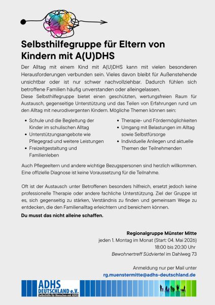 A(U)DHS? Selbsthilfegruppe für Eltern/Betroffene von Kindern mit A(U)DHS, jeden ersten Montag im Monat im Bewohnertreff Südviertel. 18:00-21:30 Uhr. Anmeldung unter rg.muenstermitte[at]adhs-deutschland.de