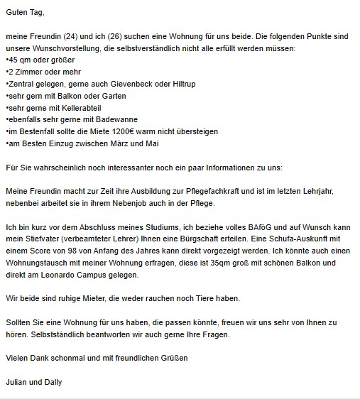 Ruhiges und zuverlässiges Paar (23 J.) sucht 2–3-Zi.-Wohnung in Münster bis 725 € kalt. Alle Unterlagen (Gehaltsnachweise, SCHUFA etc.) vorhanden. Kontakt: artemstepanov0503[at]gmail.com