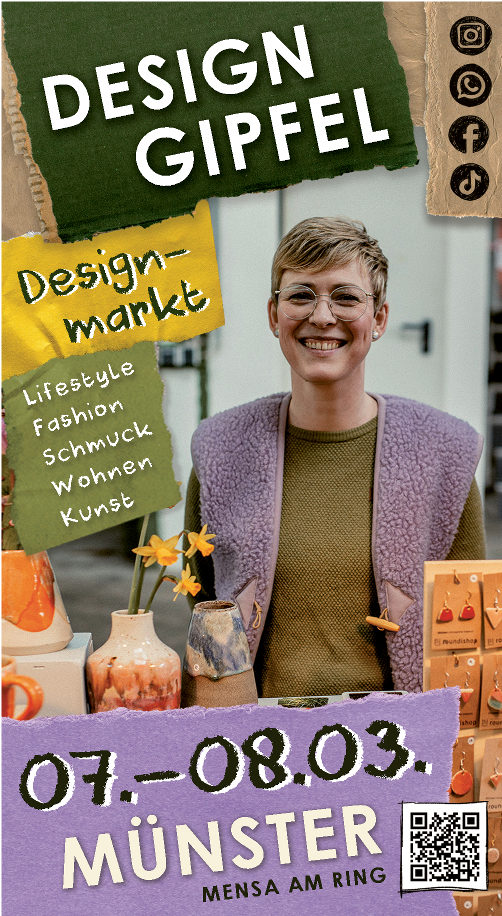 Am 07.–08. März verwandelt der Design Gipfel die Mensa am Ring in ein einen Marktplatz für Handgemachtes: 100 junge Designer:innen und kreative Köpfe präsentieren ihre individuellen Produkte – von Fashion und Accessoires über Schmuck und Grafik bis hin zu schönem für daheim. Komm vorbei, entdecke Besonderes und unterstütze lokale Kreativität! Samstag und Sonntag 12–18 Uhr Eintritt: 5 € / ermäßigt 3 € / Kinder bis 14 Jahre frei.