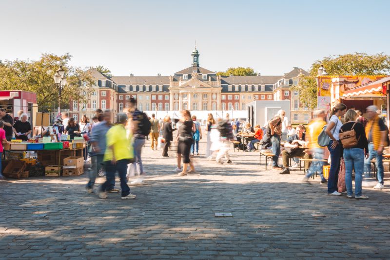 Münsters größter Flohmarkt mit rund 800 Ständen. Entdecke Vintage, Antiquitäten und Kunst. Private und gewerbliche Plätze online buchbar, zusätzlich freie Stände auf der Wiese möglich.