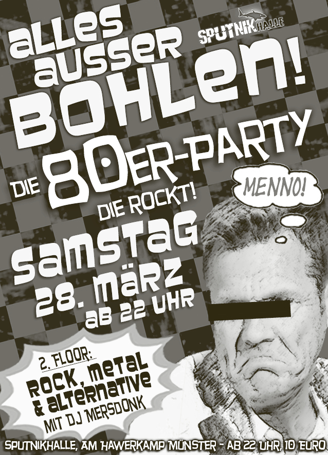 Alles außer Bohlen! Die 80er-Party die rockt! Main Floor: 80s only – Pop & Wave, Post-Punk, Synthie Pop, NDW mit DJ Niggels & DJ Chris. Floor: „Rock Café“ – Rock, Metal & Alternative mit DJ Mersdonk