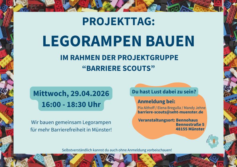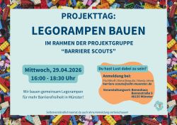Legorampen bauen - Wir möchten dazu beitragen, Münster barriereärmer zu machen. Gemeinsam bauen wir Rampen aus altem Lego, damit Gebäude, Cafés und andere Orte besser für alle zugänglich sind. Die Materialien haben wir bereits – uns fehlt nur noch eure tatkräftige Unterstützung! Außerdem: Orte gesucht!