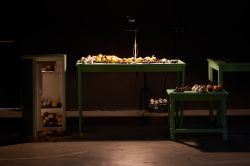 Gesichertes Gelände / RUE OBSCURE: Frei nach Max Frischs „Der Mensch erscheint im Holozän“ ist eine begehbare Installation entstanden, in der Video, Skulptur, Sound und Narration zusammenfließen. Mit Kopfhörern ausgestattet erleben die Besucher*innen sechs Stationen, die auf vielschichtige Weise das Verhältnis zwischen Mensch und Natur verhandeln. Dem Wunsch nach maximaler Stabilität steht die Fragilität des Individuums gegenüber.
